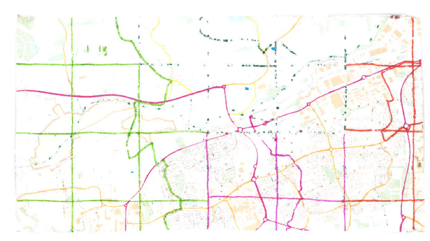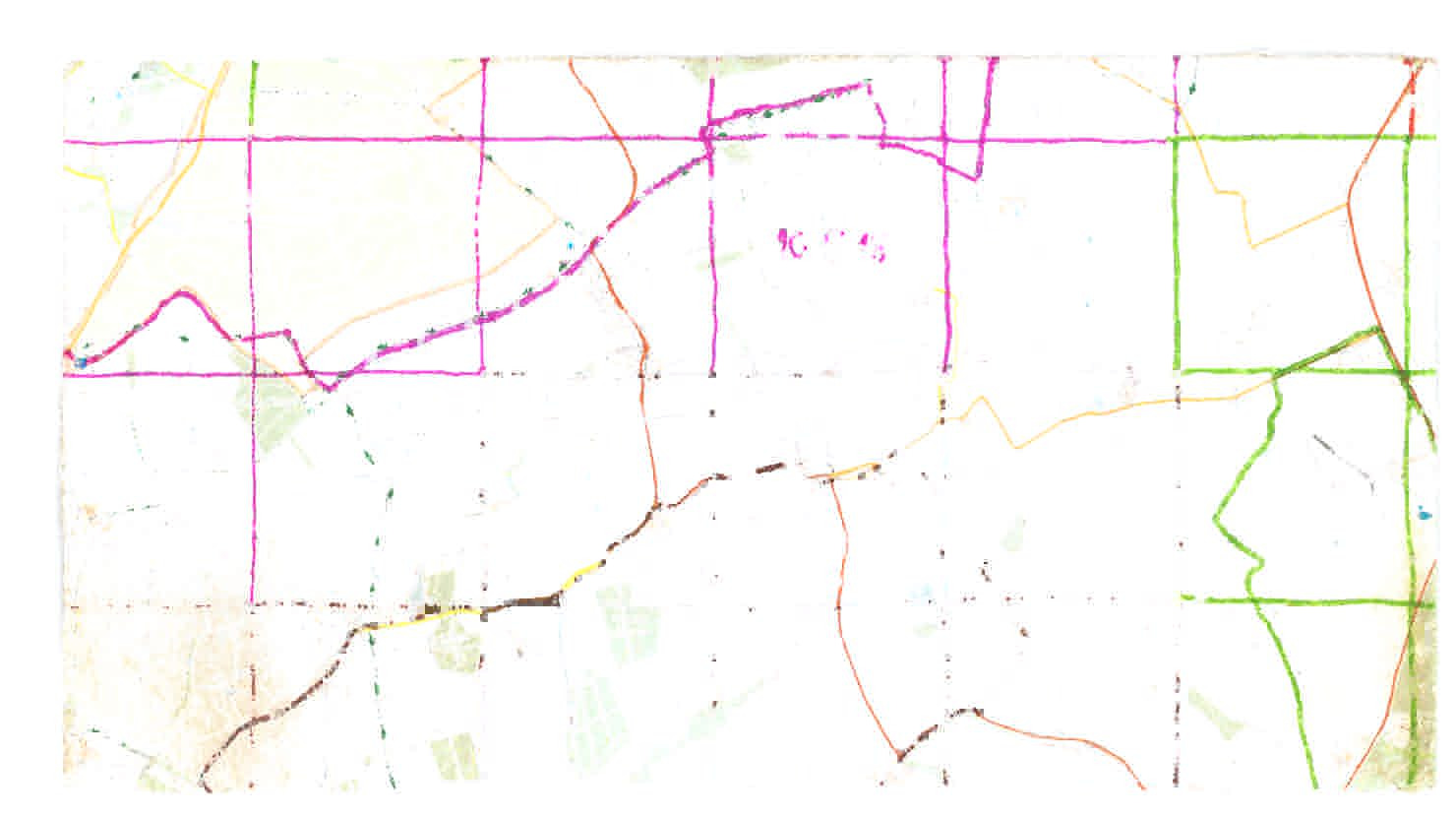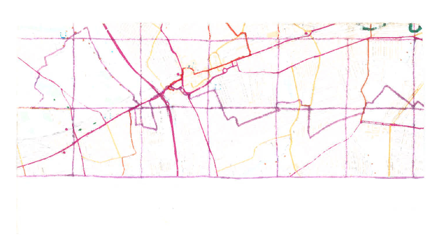 The station scores a direct hit on the grid: a tiny pink circle cut unequally into four. Getting off the train near the back, I have likely already covered three squares before I leave the platform. But I am not convinced, so I make a spiral orbit of the station, crossing the railway twice more before heading into the town.