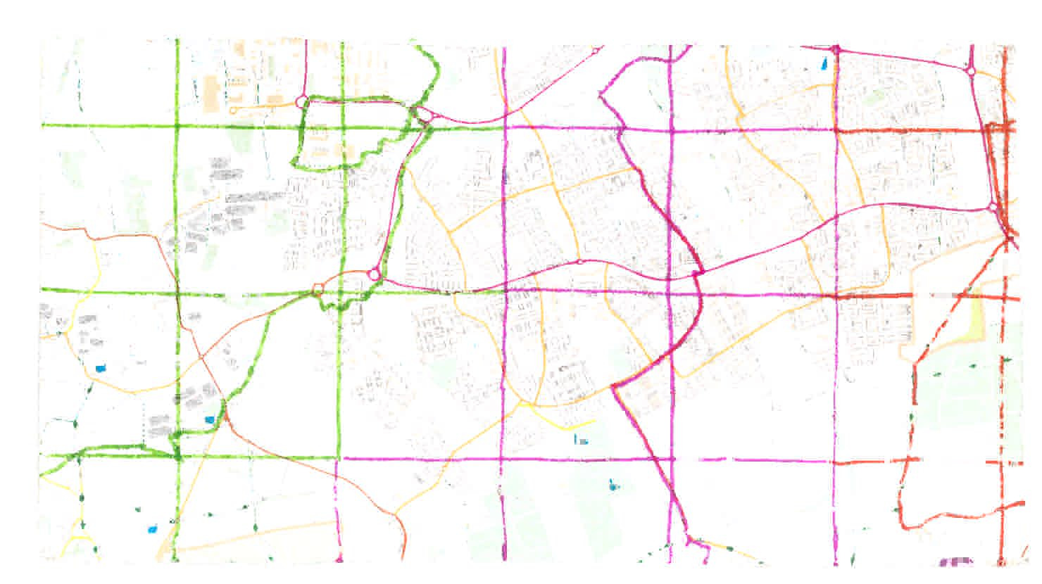 Housing estates crown the ridges, separated by green floodplains, a handprint pressed through a crust of concrete.